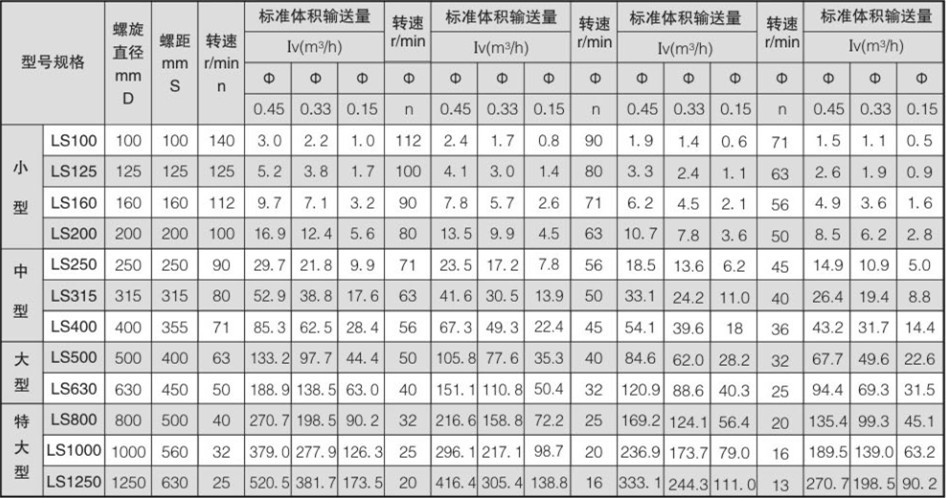水平螺旋輸送機型號表格:
